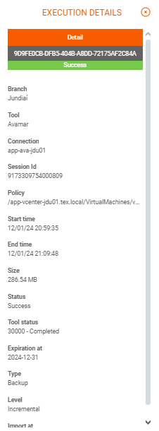 Browsing in Audit, then in Executions Log, We have the data on the executed policies, with the start time, end time, expiration date, execution size, the assets assigned to each policy, status, level and type: This alert means that the execution was ...