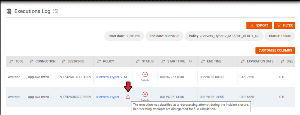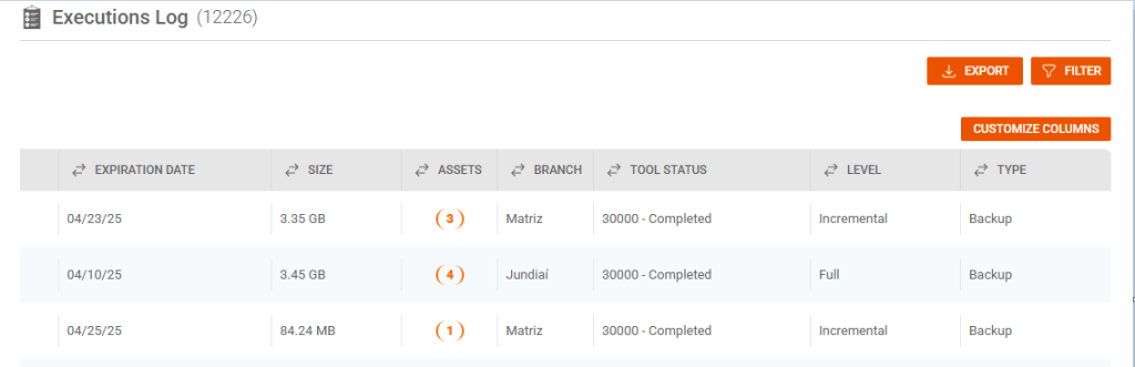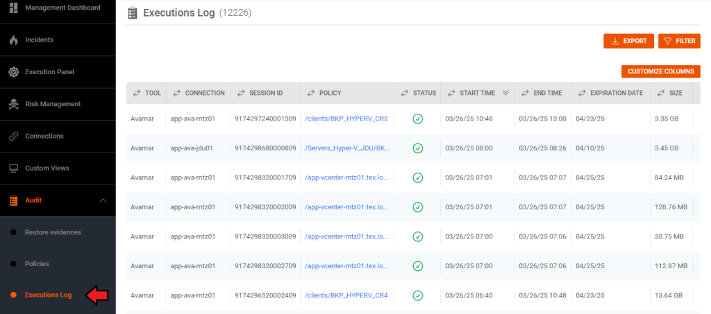 Browsing in Audit, then in Executions Log, We have the data on the executed policies, with the start time, end time, expiration date, execution size, the assets assigned to each policy, status, level and type: