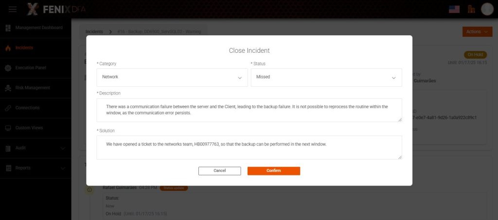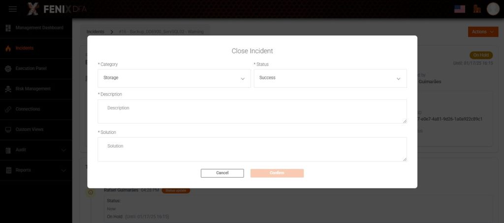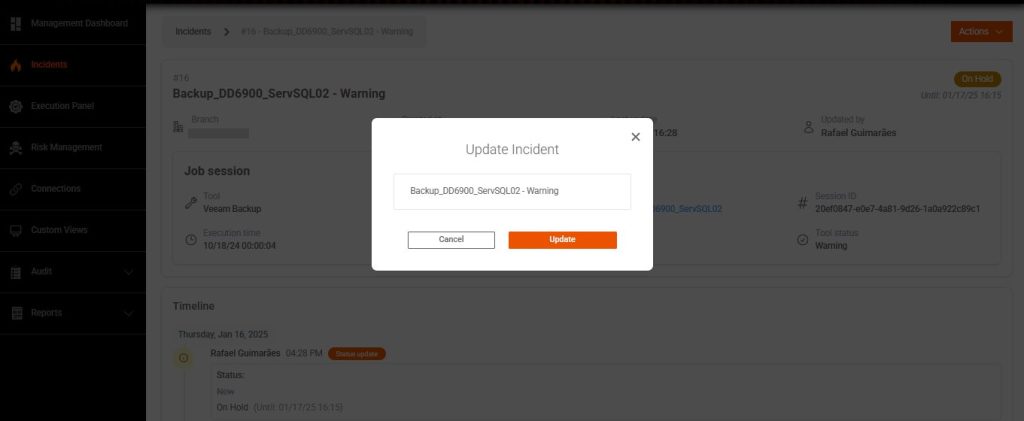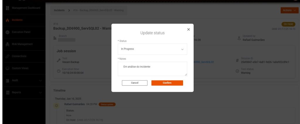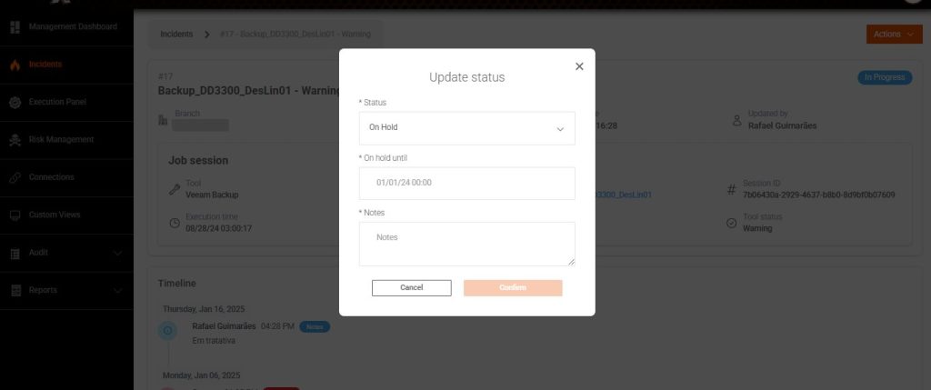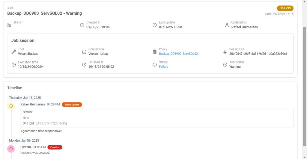In “Update Status” we can also classify as “On Hold”, so we can indicate that there is an external team responsible for the actions that will resolve the incident.