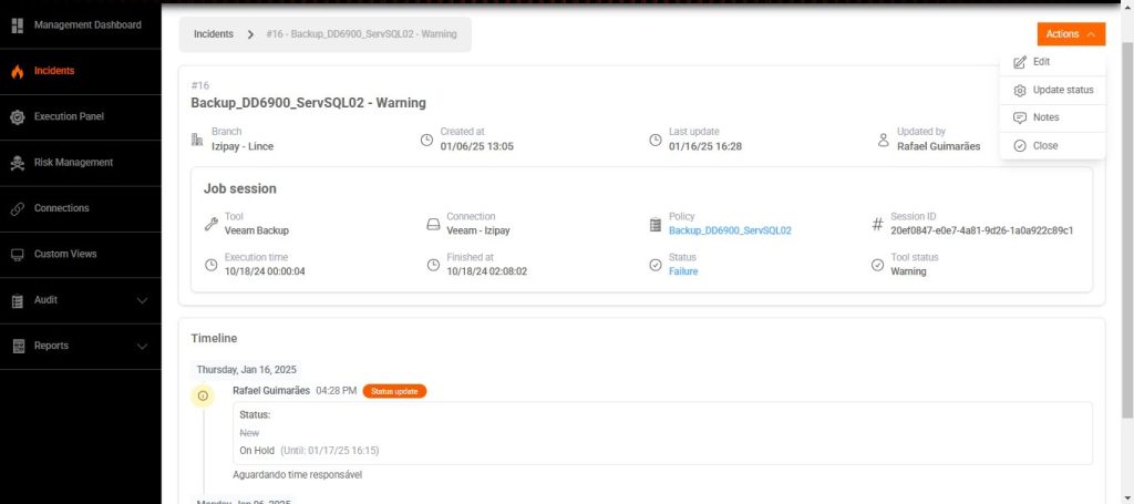 Accessing the incident by clicking on its ID, we have complete information about the failure. In “Actions”, we can “Edit”, “Update Status”, add “Notes” and “Close”.