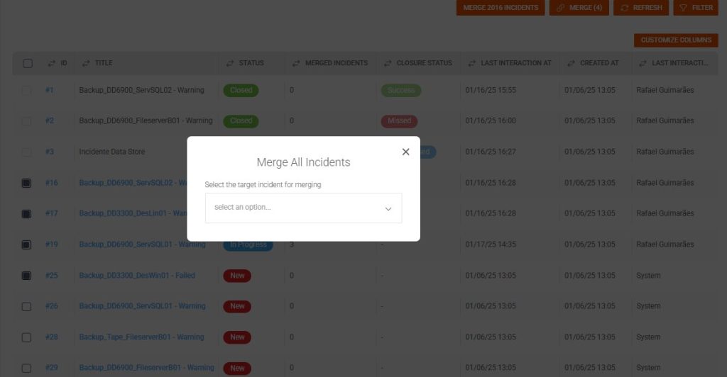 In the incidents panel, we can select multiple incidents, and if they are related in their solution, they can be “merged” into a single incident for common treatment.