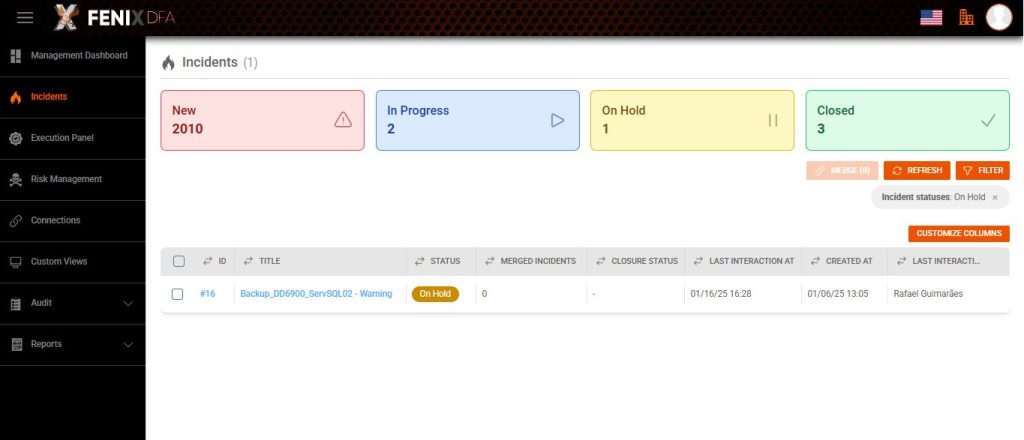 All backup routines with a termination status other than success are imported by Fenix DFA as an incident;