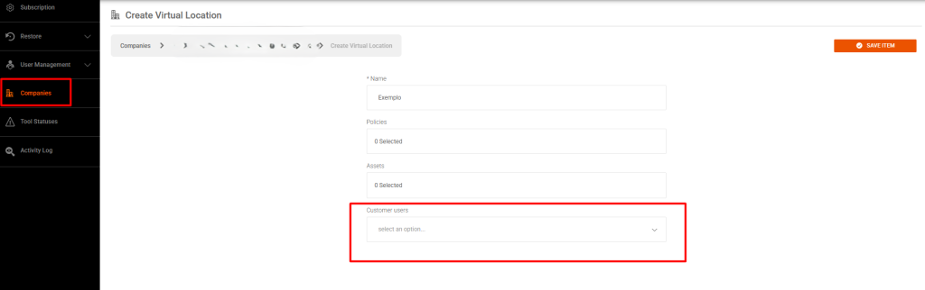 It is necessary to determine which branches the user will have access toAfter creating the user, we must go to the companies > branches > virtual location tabTo create the virtual location, it is necessary to create the name, chosen policies that the user can view, assets and the userIf you want to add more members, pay attention to users with the “Customer” role and add them to the field.