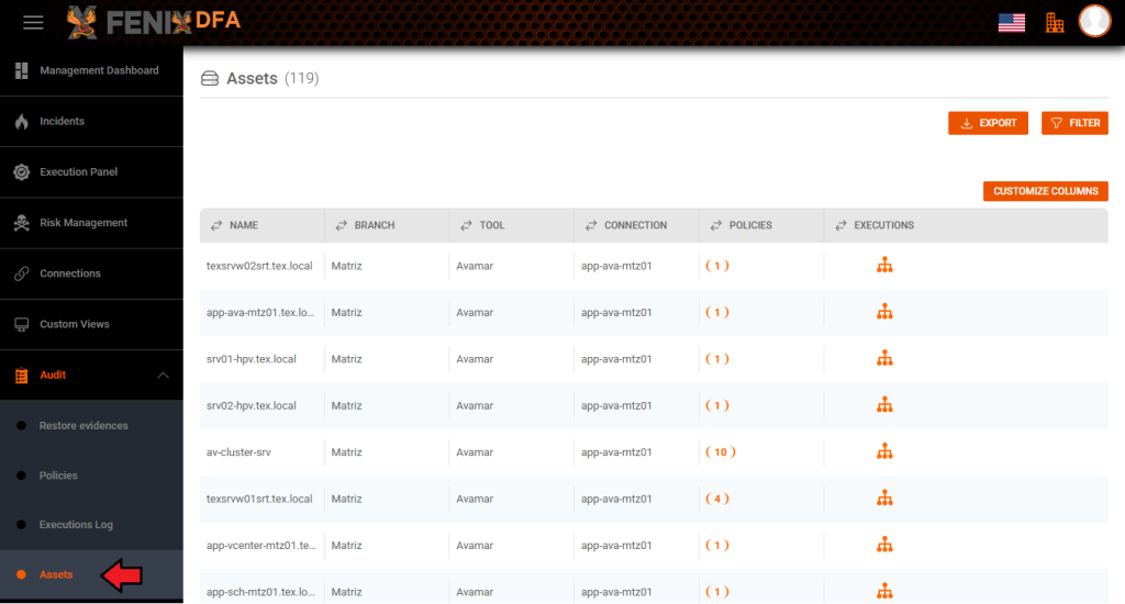 Browsing in Audit, then in Assets, we have the list of all assets detected by Fenix DFA: